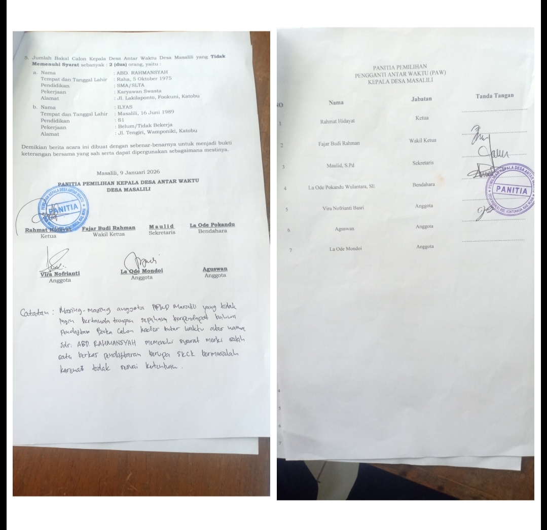 1. BA nomor 01/PPKD/DMS/I/2026 tertanggal 9 Januari 2926 tentang verifikasi berkas pendaftaran Bacalon Kades antar waktu Desa Masalili, yang ditandatangi oleh Ketua PPKD Masalili, Rahmat Hidayat dan 2 anggota lainnya yaitu Vira Novrianti dan La Ode Mondoi.